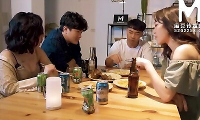 Busty Asian Chicks Get Fucked Hard By Two Men While Enjoying a Beer-Filled Meal