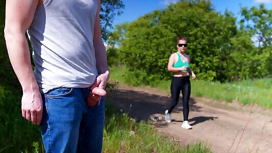 Mature ginger-haired Milf caught a guy jacking and gave him a hand job