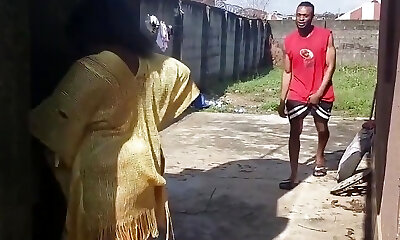 Ebony Babe Bends Over in Courtyard
